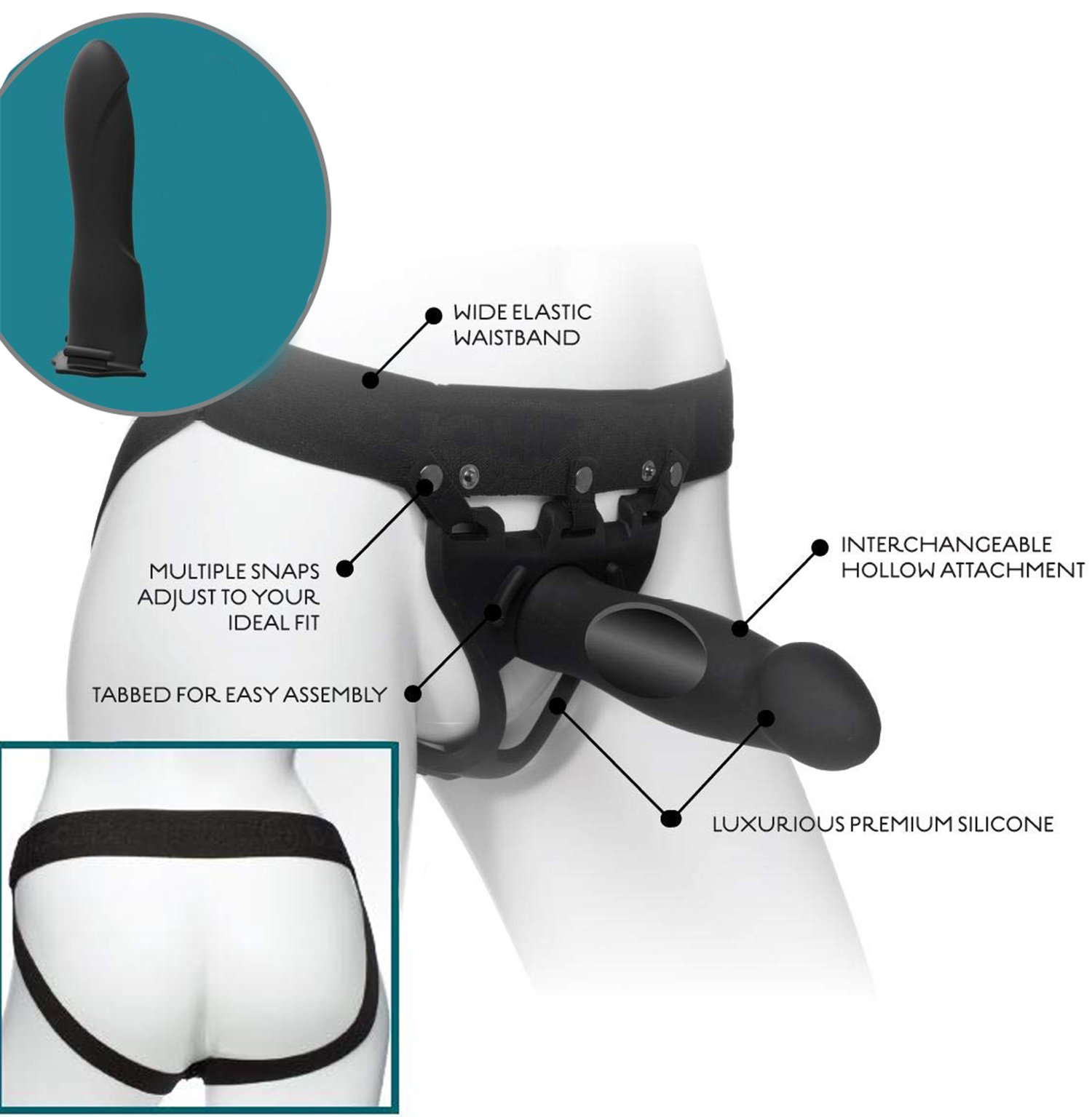The harness is equally suited for all sexes and fits up to 28 inches - 48 inches waist (71 cm - 121 cm); attachments included: (1) Bulbed Dong that measures 7 inches long and 1.75 inches diameter. Body-safe silicone material is hypoallergenic, phthalate-free for your peace of mind and compatible with your favorite water-based lube. Lubricate well for extra glide and clean up in a snap before and after use with antibacterial soap or toy cleaner and a warm water rinse. Each product in the Doc Johnson Body Extensions collection includes detailed instructions for care and usage. Be aroused with Doc Johnson`s Be Aroused Body Extensions Vibrating Hollow Strap-On Set!