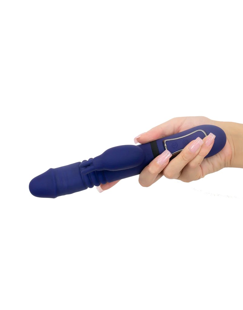 All In One This tall, smooth rabbit vibe is ready to thrust all night! With a supple, textured tip and an accordion center that stretches in and out, you`ll be amazed at the look and feel of the powerful thrust function. But this large fully submersible shape has a few more secrets up its sleeve a powerful rabbit shaft whose bunny ears just won`t quit, and rotating beads in the shaft that churn and spin with an erotic rhythm perfect for any massage! Between the thrusting, rotating and powerful vibrations, you`ll be headed for a mind-melting experience in no time, especially with the ergonomic controls that let you customize as you go. Fully rechargeable and easy to clean! Thrusting rabbit vibrator with rotating shaft beads Shaft thrusts with 3 speeds 10 powerful vibrating speeds andamp; functions Beads rotate down shaft for churning massage Vibrating rabbit stimulator Blue LED illuminates buttons when in use Made from body-safe smooth silicone Detail made from black chrome-finished ABS plastic Height: 9.8, Depth: 2.75, Width: 1.55 5 Insertable, 1.4 diameter Shaft thrusts .5 Weight: Over .5 lb Waterproof andamp; submersible Phthalate andamp; latex free Magnetic rechargeable, USB cable included