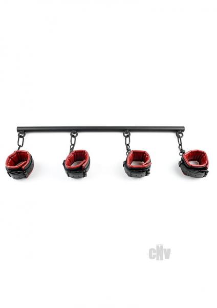Four faux leather, lightly padded adjustable cuffs in the signature red and black of the Saffron collection buckle comfortably around your wrists and ankles and clip to the spreader bar and each other in any way you can dream up. The strong, solid spreader bar`s rings are firmly welded in place, so there`s no escape...only release.